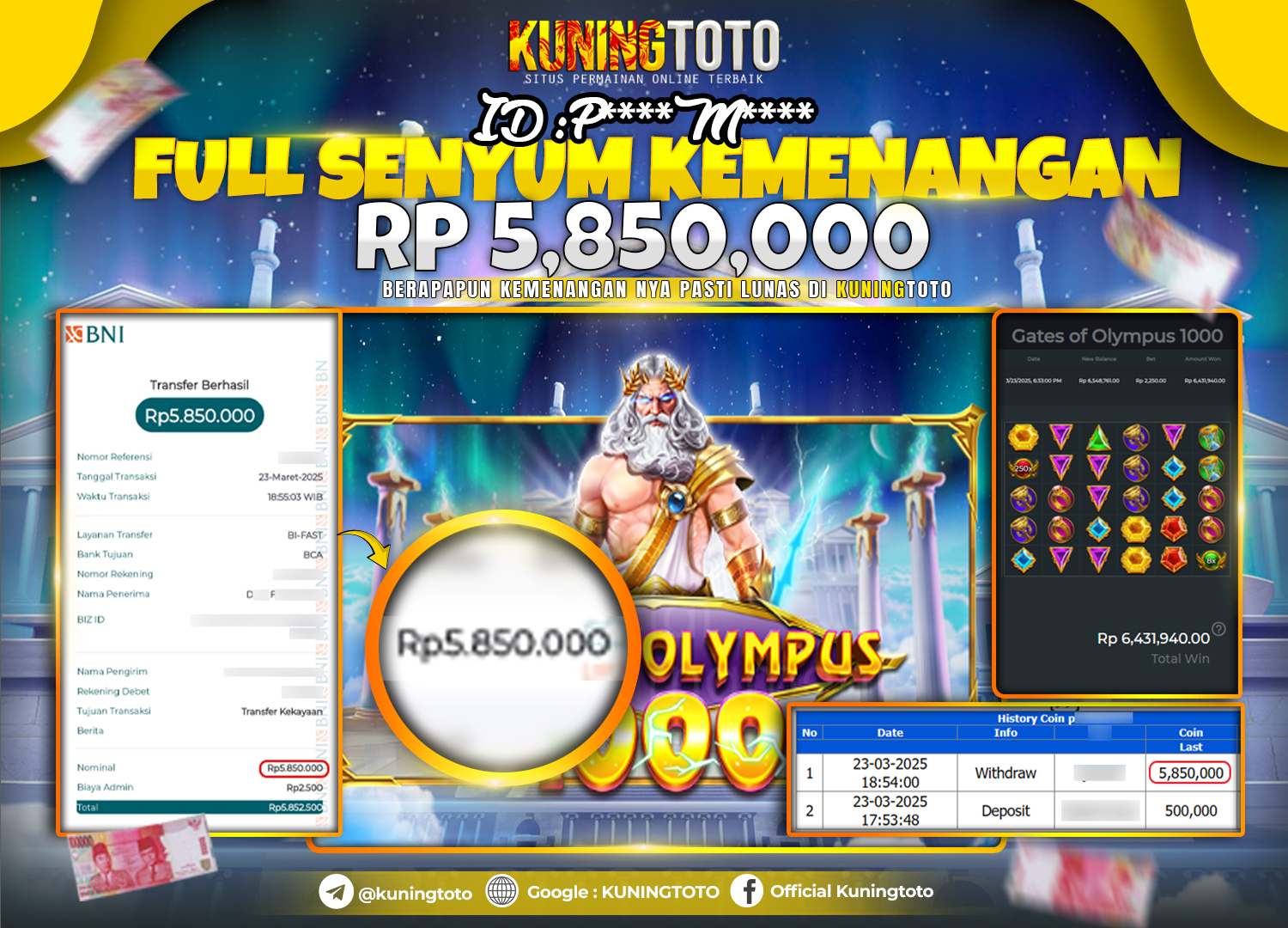 Bukti JackPot Slot Member KUNINGTOTO 23 Maret 2025 Gate Of Olympus 1000