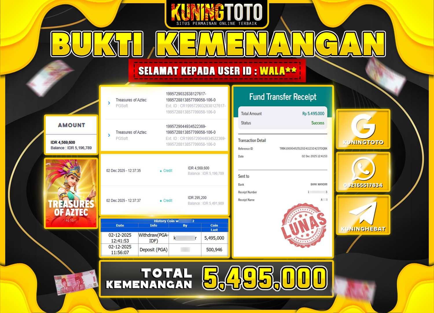 Bukti Kemenangan Slot KuningToto 02 Desember 2025 Slot Treasures of Aztec