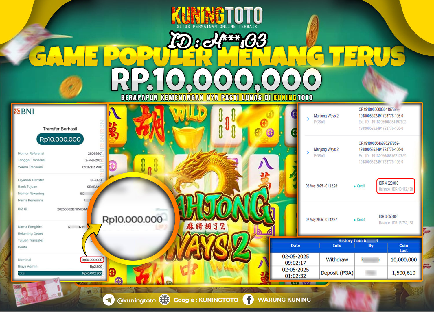 Bukti JackPot Slot Member KUNINGTOTO 02 Mei 2025 Slot Mahjong Ways 2