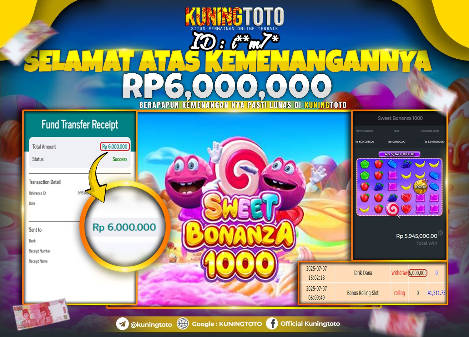 Bukti JackPot Slot Member KUNINGTOTO 07 Juli 2025 Slot Sweet Bonanza 1000