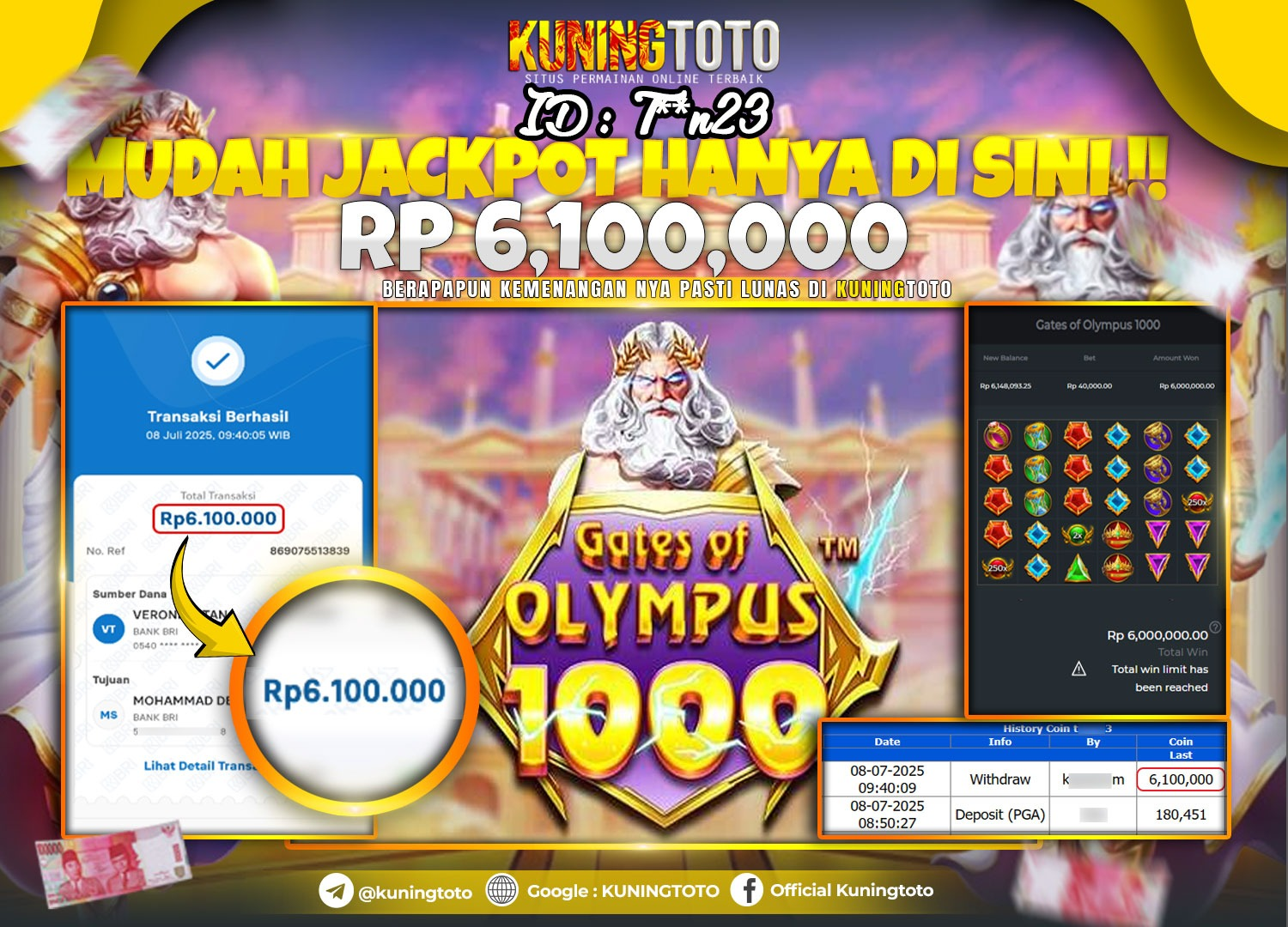 Bukti JackPot Slot Member KUNINGTOTO 08 Juli 2025 Slot Gates Of Olympus 1000