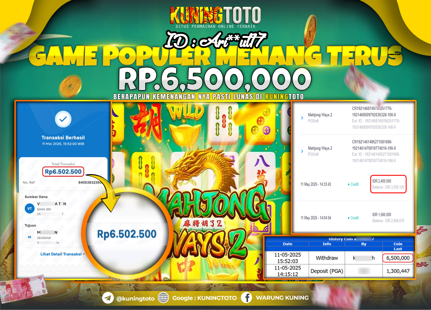 Bukti JackPot Slot Member KUNINGTOTO 11 Mei 2025 Slot Mahjong Ways 2