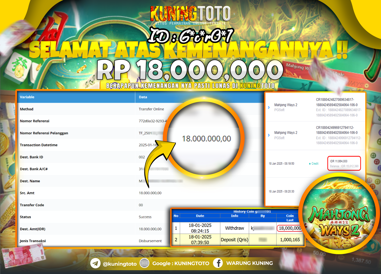 Bukti JackPot Slot Member KUNINGTOTO 18 Januari 2025 Slot Mahjong Ways 2