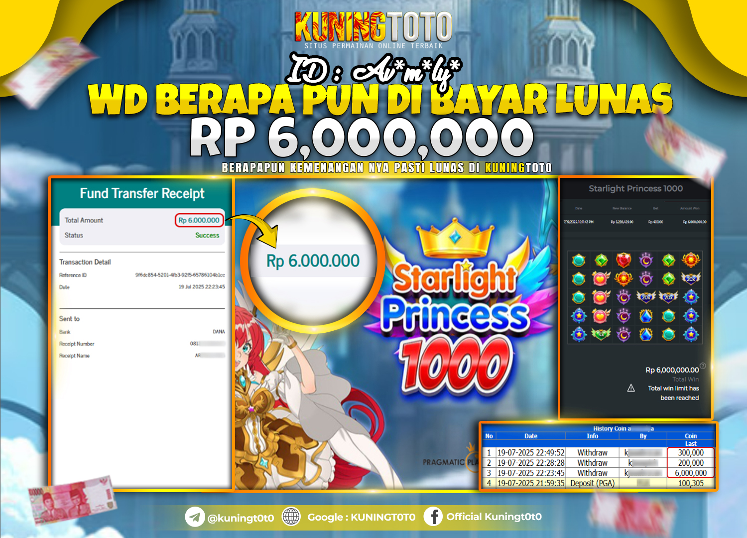 Bukti JackPot Slot Member KUNINGTOTO 19 Juli 2025 Slot Starlight Princess 1000