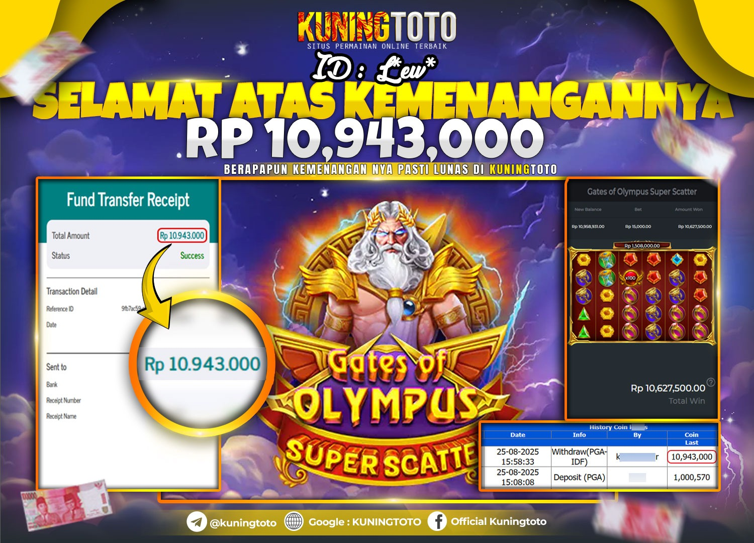 Bukti Kemenangan Slot KuningToto 25 Agustus 2025 Slot Gates Of Olympus Super Scatter