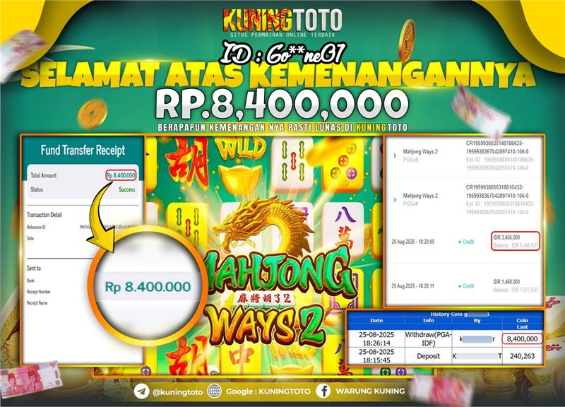 Bukti Kemenangan Slot KuningToto 25 Agustus 2025 Slot Mahjong Ways 2