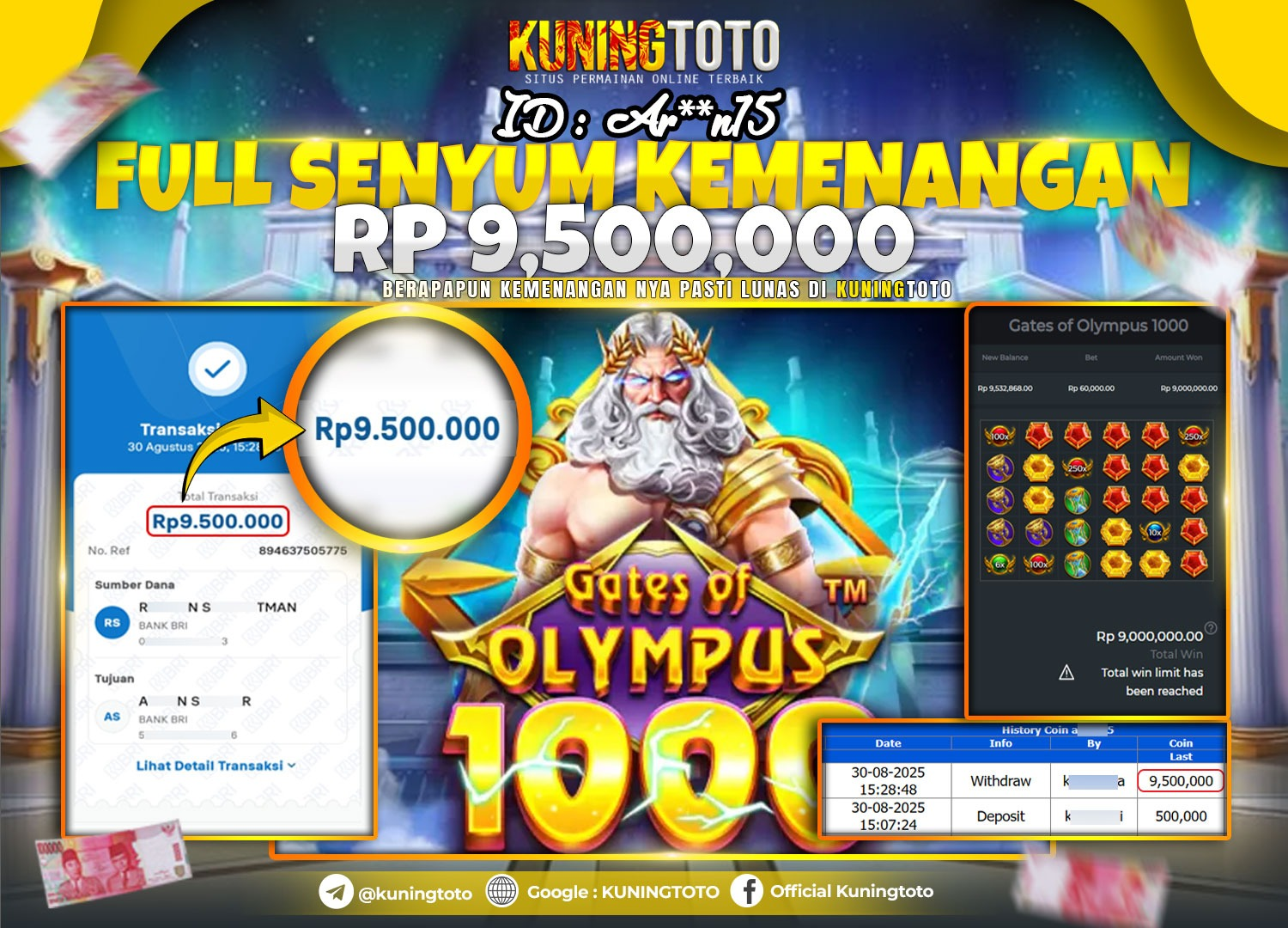 Bukti Kemenangan Slot KuningToto 30 Agustus 2025 Slot Gate of Olympus 1000