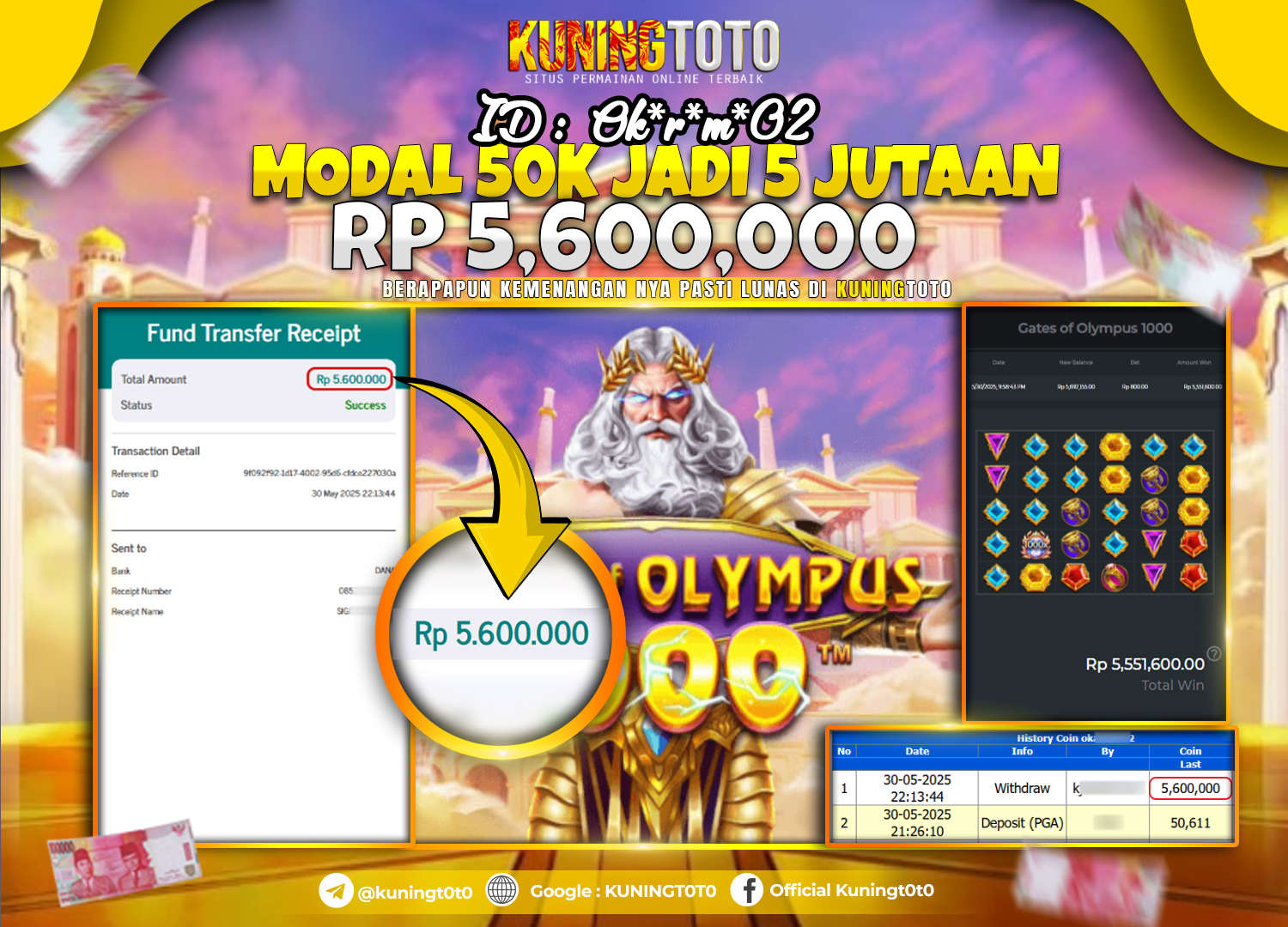Bukti Kemenangan Slot KuningToto 30 Mei 2025 Slot Gates Of Olympus 1000