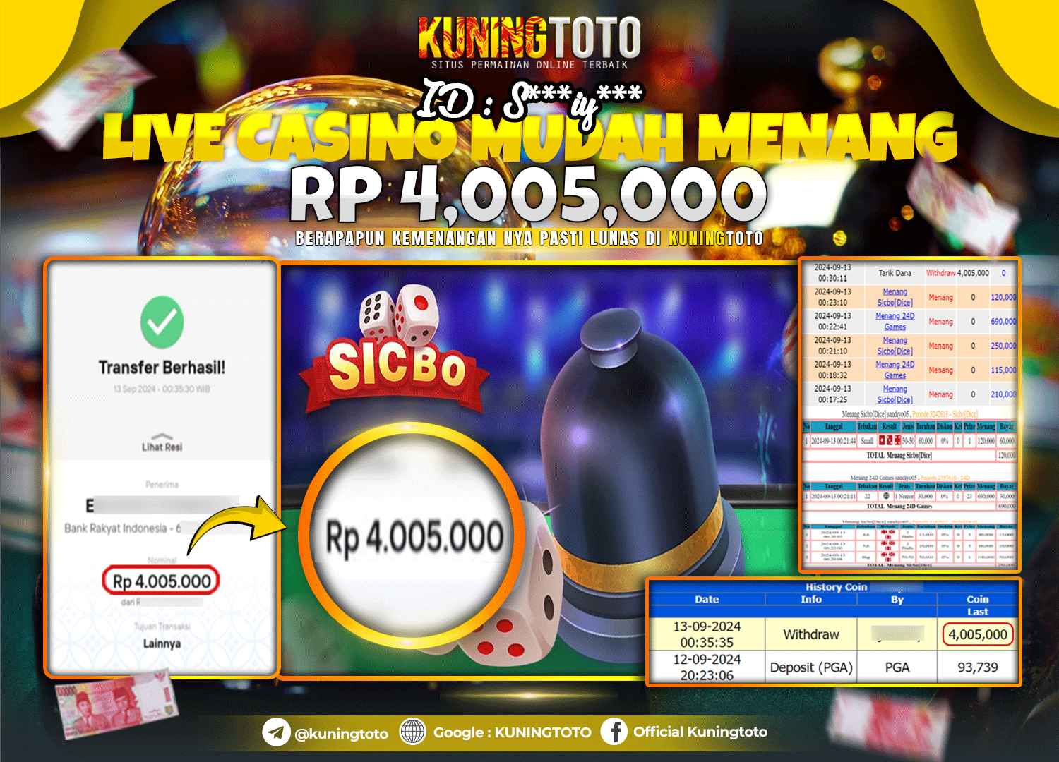 Bukti JackPot Live Casino Member KUNINGTOTO 16 Oktober 2024 PP Live Mega Sicbo Memenangkan Jackpot Permainan Slot online sangat populer…