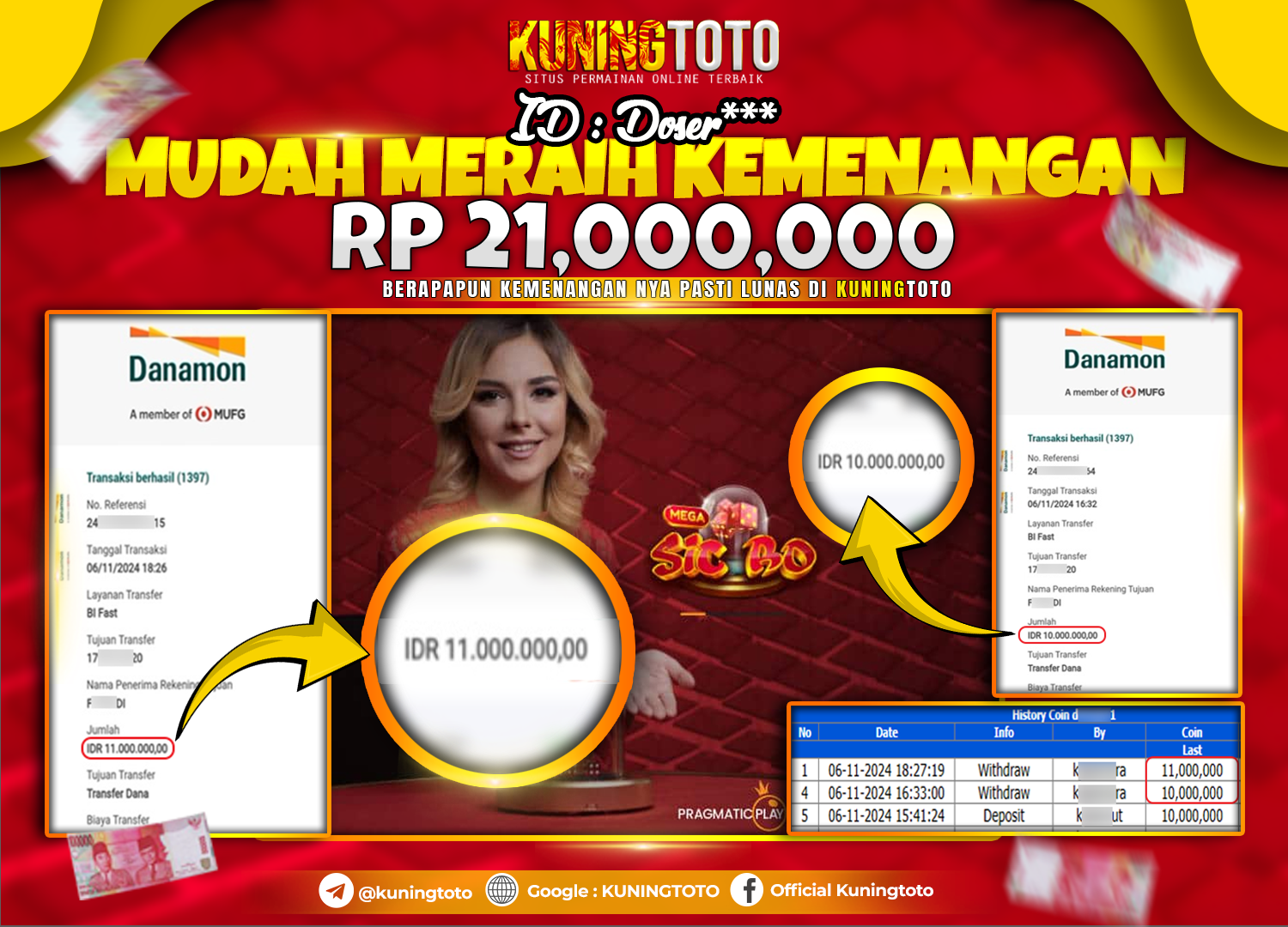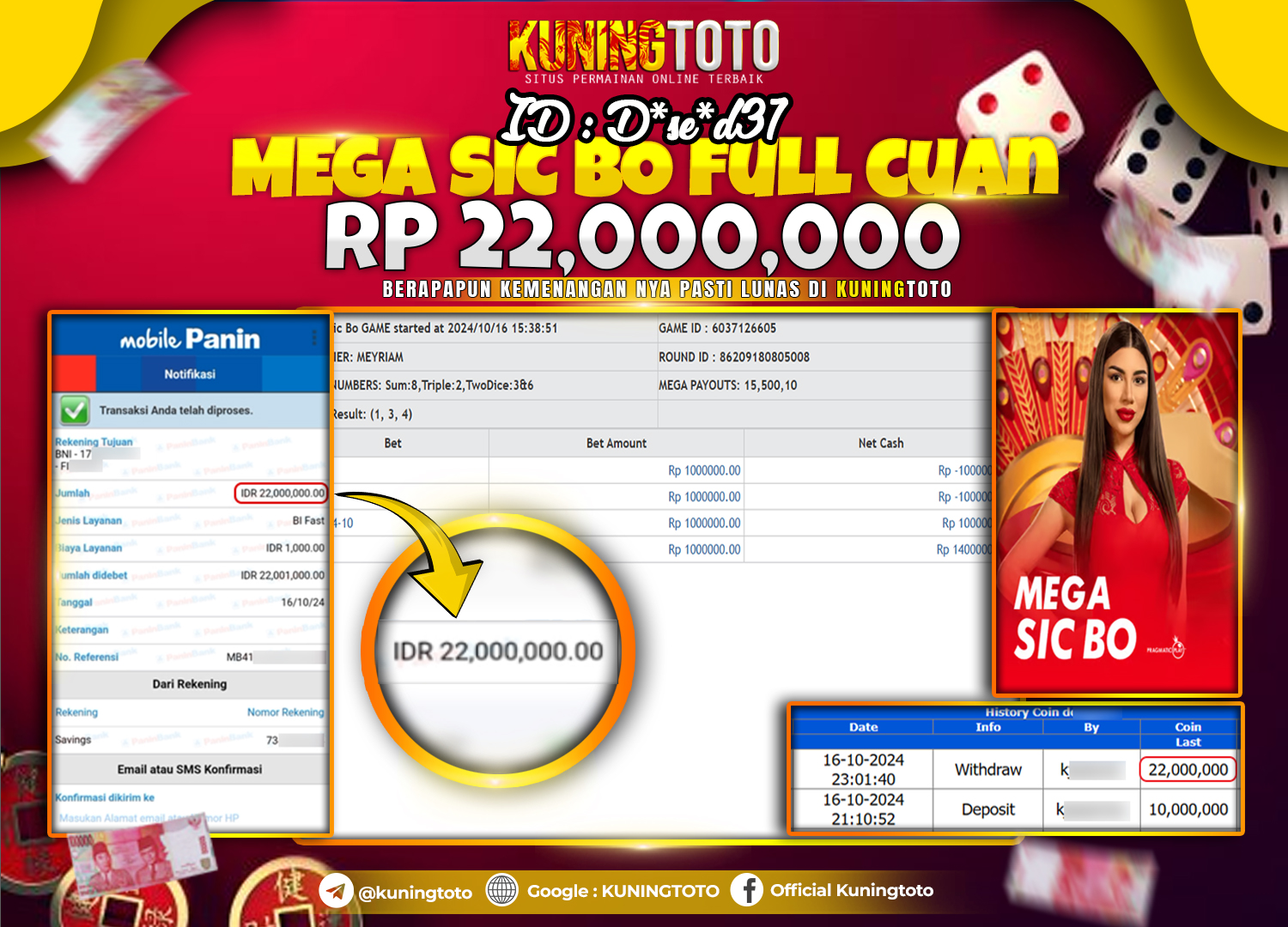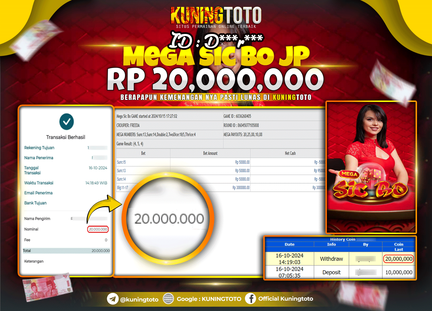Bukti JackPot Live Casino Member KUNINGTOTO 16 Oktober 2024 Mega Sicbo – PP Live Dealer Memenangkan Jackpot Permainan Slot online…