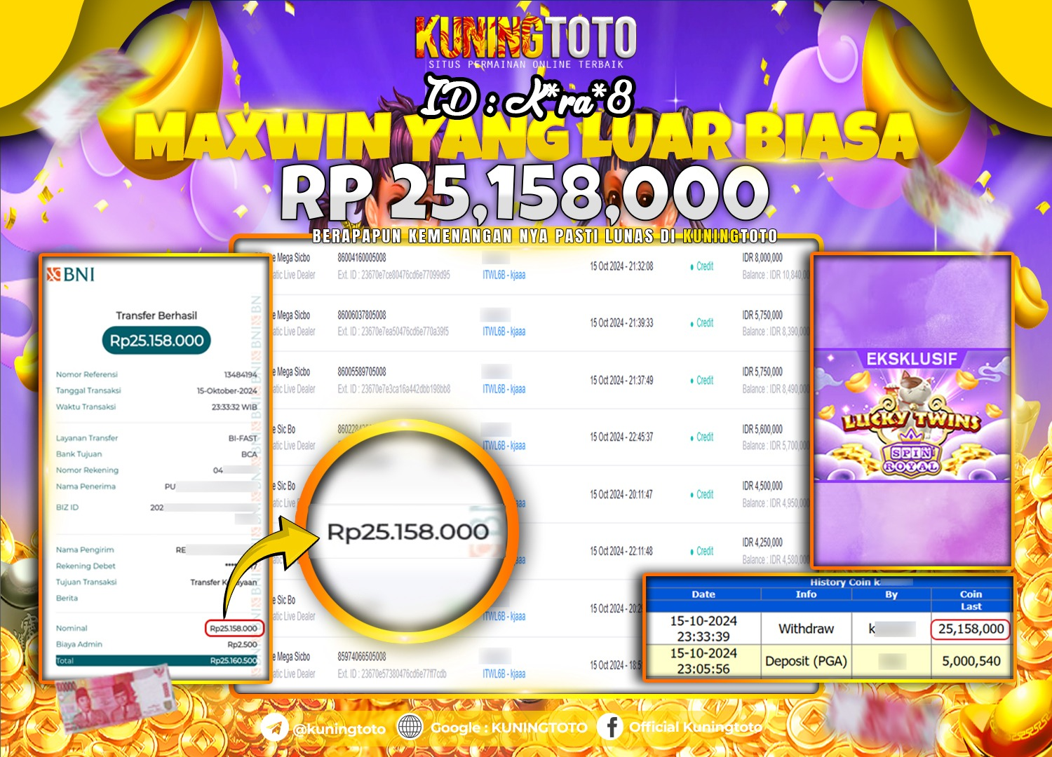 Bukti JackPot Slot Member KUNINGTOTO 17 Oktober 2024 Lucky Twins Spin Royal Memenangkan Jackpot Permainan Slot online sangat populer di…