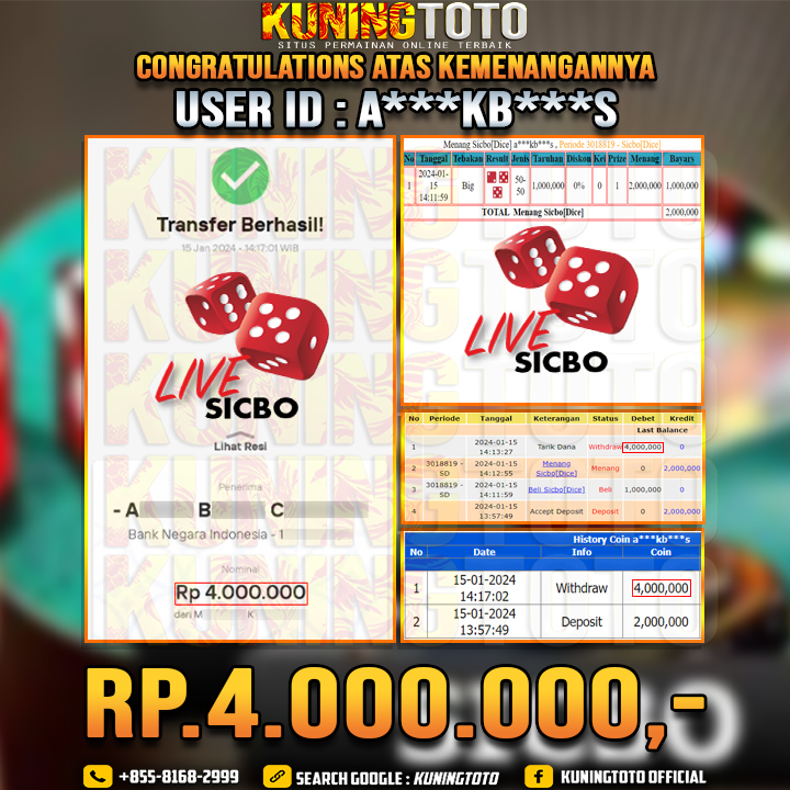Bukti JP Live Casino Member Kuningtoto 15 Januari 2024 Sicbo Dice Memenangkan Jackpot Permainan Live Casino sangat populer di kalangan…
