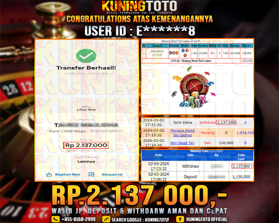 Bukti JP Live Casino Member KUNING TOTO 02 Maret 2024 Head and Tail Memenangkan Jackpot Permainan Live Casino sangat populer…