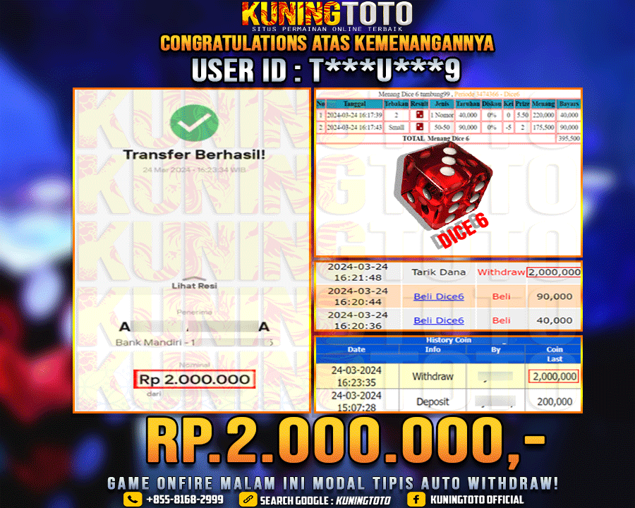 Bukti JP Live Casino Member KUNING TOTO 24 Maret 2024 Dice 6 Memenangkan Jackpot Permainan Live Casino sangat populer di…