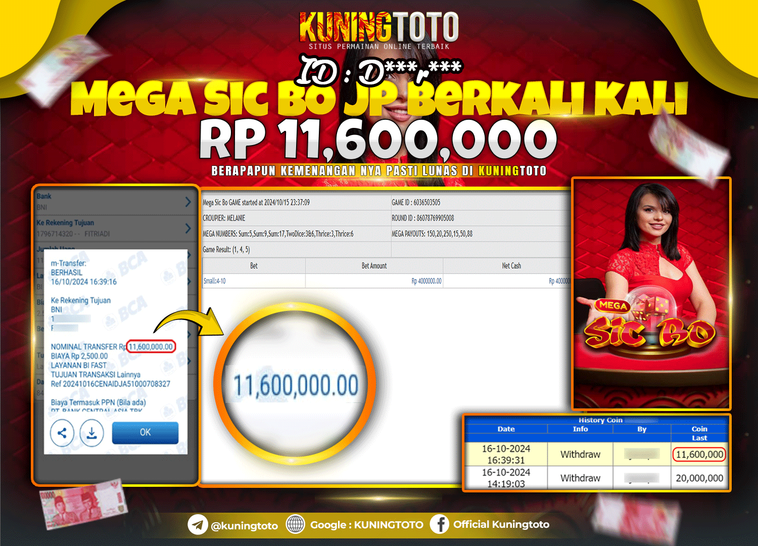 Bukti JackPot Live Casino Member KUNINGTOTO 16 Oktober 2024 PP Live Mega Sicbo Memenangkan Jackpot Permainan Slot online sangat populer…