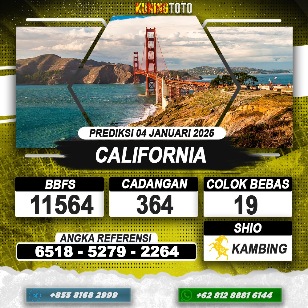 PREDIKSI TOGEL CALIFORNIA 04 JANUARI 2026 – Selamat Datang di Situs Prediksi Togel Online Akurat dan Resmi KUNINGTOTO. Permainan Togel atau Toto Gelap ini telah lama menarik perhatian dan banyak dimainkan oleh para bettor. Sejak dulu permainan togel dimainkan dengan memasang taruhan angka dengan bandar darat yang tersedia di daerah masing – masing. Namun sekarang ini dengan perkembangan teknologi yang semakin maju, para bettor bisa menikmati permainan togel secara online. Anda bisa menemukan banyak6ya Situs Bandar Togel Online yang menyediakan layanan pemaangan angka togel secara praktis. Dimana masing – masing situs bandar togel online resmi dan terpercaya tentu menyediakan layanan dan keuntungan yang berbeda – beda untuk Anda.