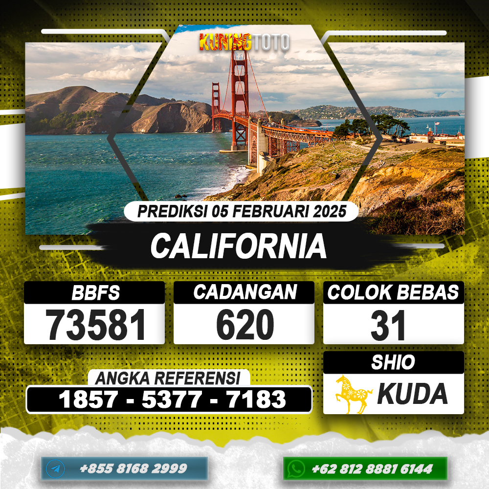 PREDIKSI TOGEL CALIFORNIA 05 FEB 2025 – Selamat Datang di Situs Prediksi Togel Online Akurat dan Resmi KUNINGTOTO. Permainan Togel atau Toto Gelap ini telah lama menarik perhatian dan banyak dimainkan oleh para bettor. Sejak dulu permainan togel dimainkan dengan memasang taruhan angka dengan bandar darat yang tersedia di daerah masing – masing. Namun sekarang ini dengan perkembangan teknologi yang semakin maju, para bettor bisa menikmati permainan togel secara online. Anda bisa menemukan banyak6ya Situs Bandar Togel Online yang menyediakan layanan pemaangan angka togel secara praktis. Dimana masing – masing situs bandar togel online resmi dan terpercaya tentu menyediakan layanan dan keuntungan yang berbeda – beda untuk Anda.