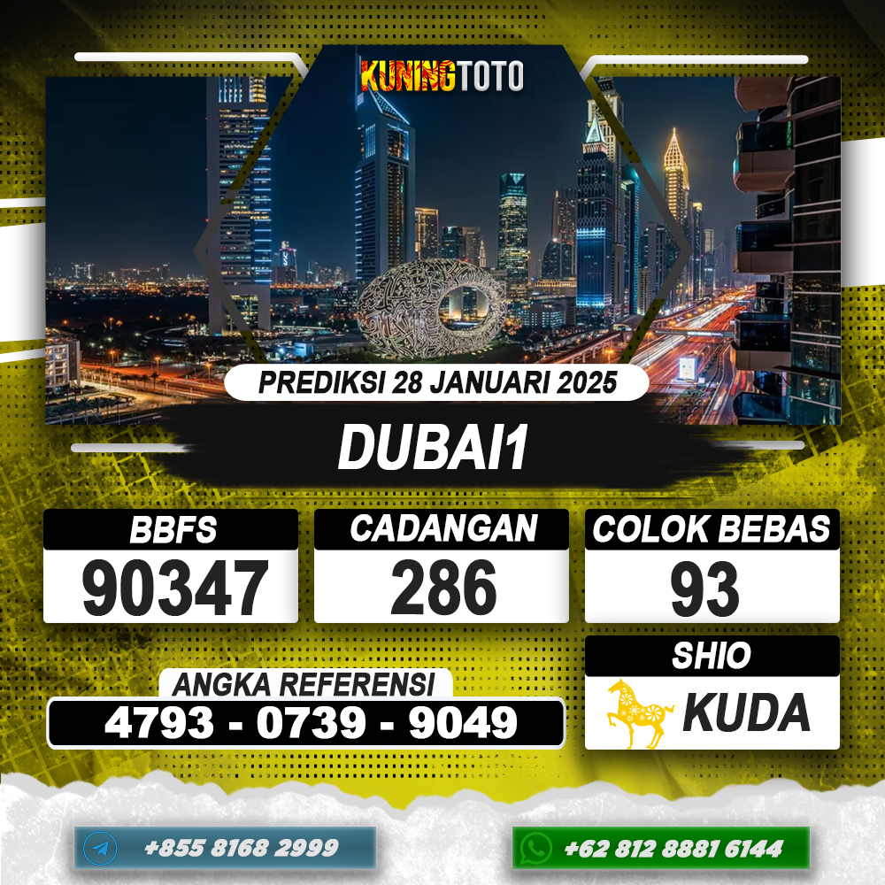 PREDIKSI TOGEL DUBAI1 28 JAN 2025 – Selamat Datang di Situs Prediksi Togel Online Akurat dan Resmi KUNINGTOTO. Permainan Togel atau Toto Gelap ini telah lama menarik perhatian dan banyak dimainkan oleh para bettor. Sejak dulu permainan togel dimainkan dengan memasang taruhan angka dengan bandar darat yang tersedia di daerah masing – masing. Namun sekarang ini dengan perkembangan teknologi yang semakin maju, para bettor bisa menikmati permainan togel secara online. Anda bisa menemukan banyak6ya Situs Bandar Togel Online yang menyediakan layanan pemaangan angka togel secara praktis. Dimana masing – masing situs bandar togel online resmi dan terpercaya tentu menyediakan layanan dan keuntungan yang berbeda – beda untuk Anda.