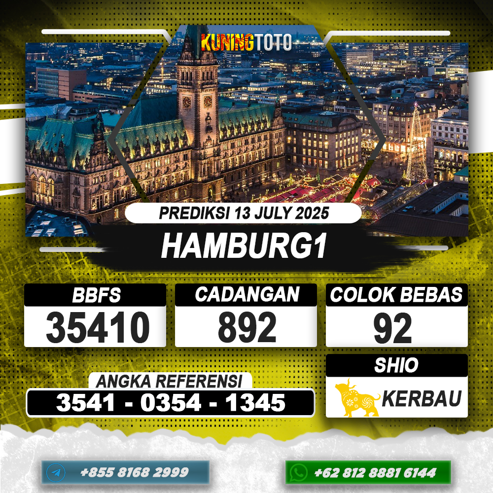 PREDIKSI TOGEL HAMBURG1 13 JULI 2025 – Selamat Datang di Situs Prediksi Togel Online Akurat dan Resmi KUNINGTOTO. Permainan Togel atau Toto Gelap ini telah lama menarik perhatian dan banyak dimainkan oleh para bettor. Sejak dulu permainan togel dimainkan dengan memasang taruhan angka dengan bandar darat yang tersedia di daerah masing – masing. Namun sekarang ini dengan perkembangan teknologi yang semakin maju, para bettor bisa menikmati permainan togel secara online. Anda bisa menemukan banyak6ya Situs Bandar Togel Online yang menyediakan layanan pemaangan angka togel secara praktis. Dimana masing – masing situs bandar togel online resmi dan terpercaya tentu menyediakan layanan dan keuntungan yang berbeda – beda untuk Anda.