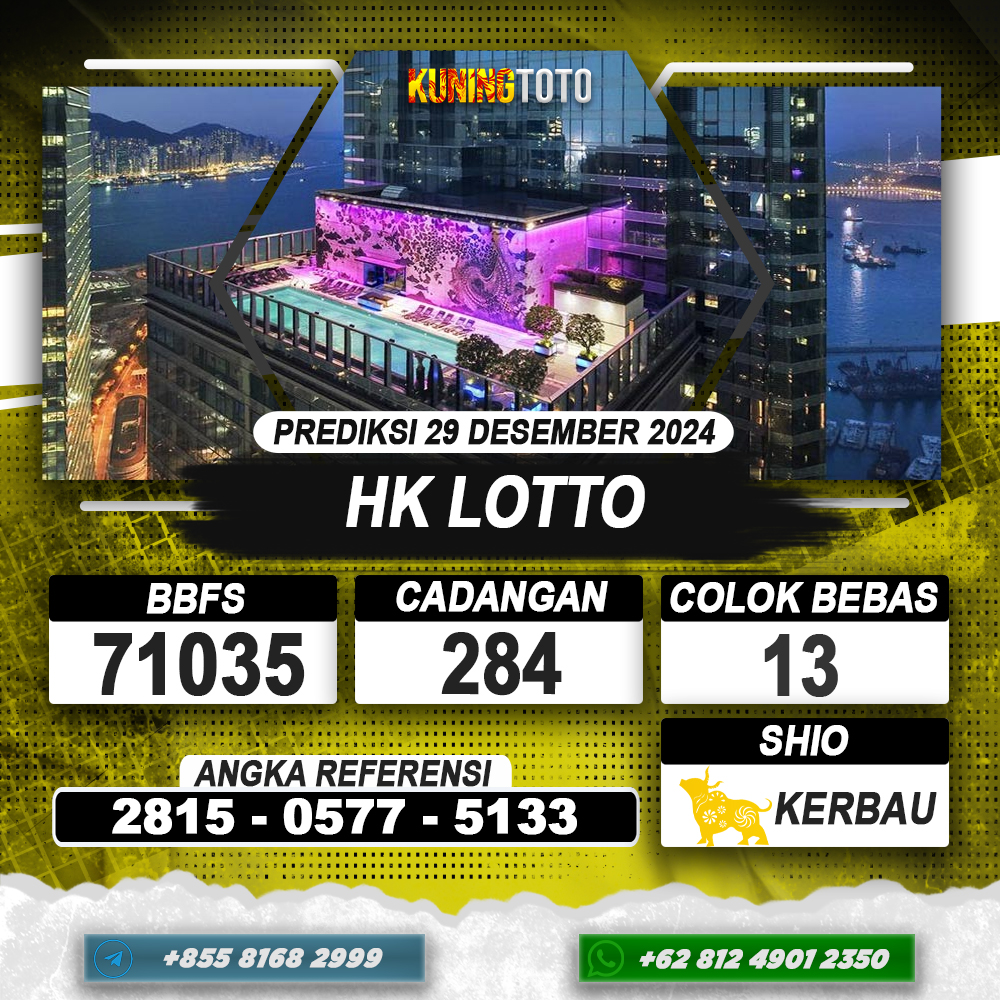 PREDIKSI TOGEL HONGKONG LOTTO 29 DEC 2024 – Selamat Datang di Situs Prediksi Togel Online Akurat dan Resmi KUNINGTOTO. Permainan Togel atau Toto Gelap ini telah lama menarik perhatian dan banyak dimainkan oleh para bettor. Sejak dulu permainan togel dimainkan dengan memasang taruhan angka dengan bandar darat yang tersedia di daerah masing – masing. Namun sekarang ini dengan perkembangan teknologi yang semakin maju, para bettor bisa menikmati permainan togel secara online. Anda bisa menemukan banyaknya Situs Bandar Togel Online yang menyediakan layanan pemasangan angka togel secara praktis. Dimana masing – masing situs bandar togel online resmi dan terpercaya tentu menyediakan layanan dan keuntungan yang berbeda – beda untuk Anda.
