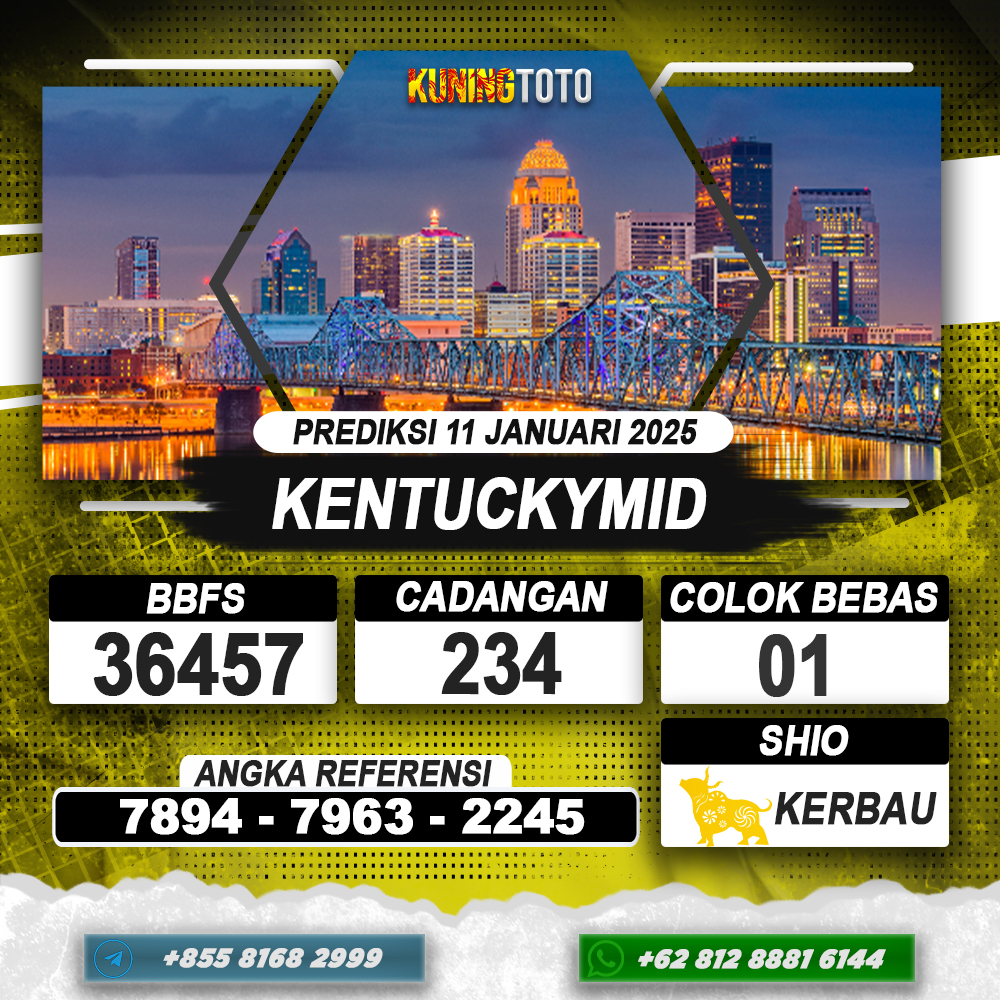PREDIKSI TOGEL KENTUCKYMID 11 JAN 2025 – Selamat Datang di Situs Prediksi Togel Online Akurat dan Resmi KUNINGTOTO. Permainan Togel atau Toto Gelap ini telah lama menarik perhatian dan banyak dimainkan oleh para bettor. Sejak dulu permainan togel dimainkan dengan memasang taruhan angka dengan bandar darat yang tersedia di daerah masing – masing. Namun sekarang ini dengan perkembangan teknologi yang semakin maju, para bettor bisa menikmati permainan togel secara online. Anda bisa menemukan banyak6ya Situs Bandar Togel Online yang menyediakan layanan pemaangan angka togel secara praktis. Dimana masing – masing situs bandar togel online resmi dan terpercaya tentu menyediakan layanan dan keuntungan yang berbeda – beda untuk Anda.