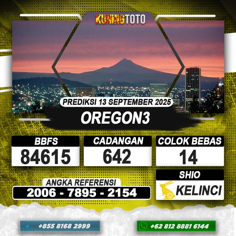 PREDIKSI TOGELOREGON3 13 SEPTEMBER 2025 – Selamat Datang di Situs Prediksi Togel Online Akurat dan Resmi KUNINGTOTO. Permainan Togel atau Toto Gelap ini telah lama menarik perhatian dan banyak dimainkan oleh para bettor. Sejak dulu permainan togel dimainkan dengan memasang taruhan angka dengan bandar darat yang tersedia di daerah masing – masing. Namun sekarang ini dengan perkembangan teknologi yang semakin maju, para bettor bisa menikmati permainan togel secara online. Anda bisa menemukan banyak6ya Situs Bandar Togel Online yang menyediakan layanan pemaangan angka togel secara praktis. Dimana masing – masing situs bandar togel online resmi dan terpercaya tentu menyediakan layanan dan keuntungan yang berbeda – beda untuk Anda.