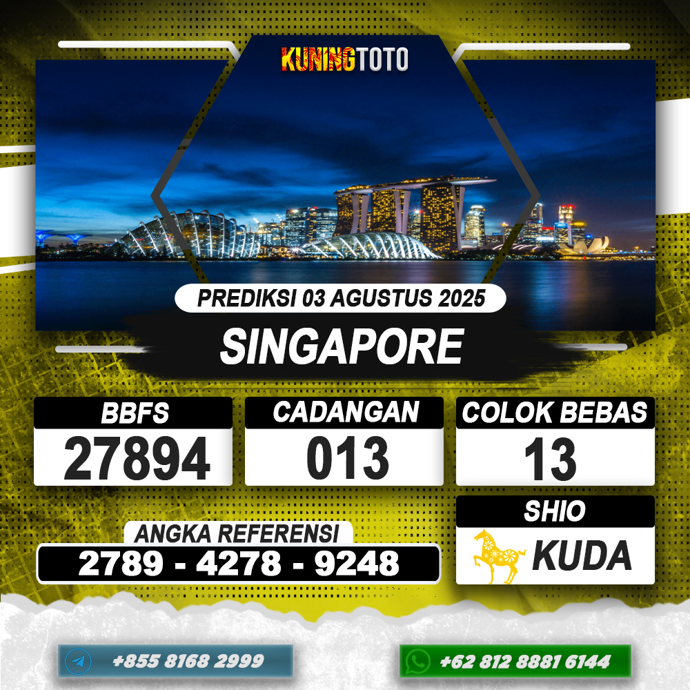 PREDIKSI TOGEL SINGAPORE 03 AGUSTUS 2025 – Selamat Datang di Situs Prediksi Togel Online Akurat dan Resmi KUNINGTOTO. Permainan Togel atau Toto Gelap ini telah lama menarik perhatian dan banyak dimainkan oleh para bettor. Sejak dulu permainan togel dimainkan dengan memasang taruhan angka dengan bandar darat yang tersedia di daerah masing – masing. Namun sekarang ini dengan perkembangan teknologi yang semakin maju, para bettor bisa menikmati permainan togel secara online. Anda bisa menemukan banyak6ya Situs Bandar Togel Online yang menyediakan layanan pemaangan angka togel secara praktis. Dimana masing – masing situs bandar togel online resmi dan terpercaya tentu menyediakan layanan dan keuntungan yang berbeda – beda untuk Anda.