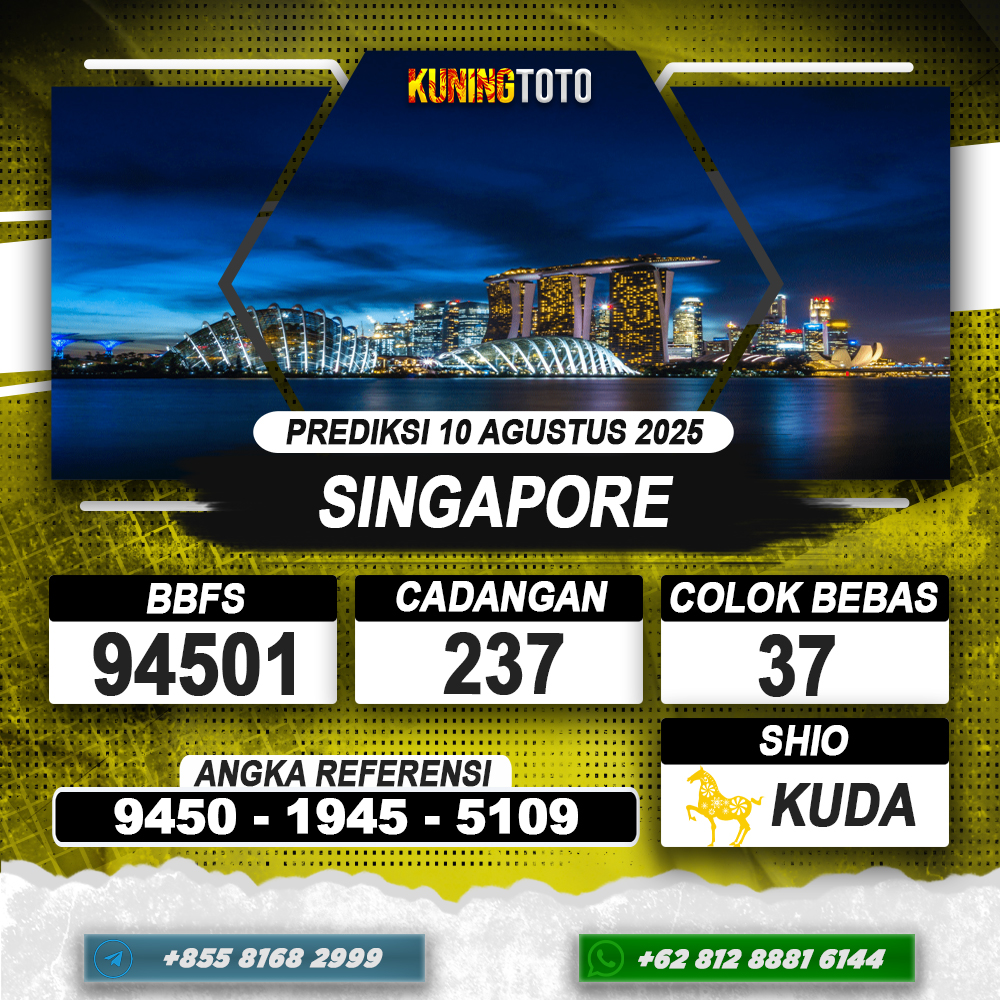 PREDIKSI TOGEL SINGAPORE 10 AGUSTUS 2025 – Selamat Datang di Situs Prediksi Togel Online Akurat dan Resmi KUNINGTOTO. Permainan Togel atau Toto Gelap ini telah lama menarik perhatian dan banyak dimainkan oleh para bettor. Sejak dulu permainan togel dimainkan dengan memasang taruhan angka dengan bandar darat yang tersedia di daerah masing – masing. Namun sekarang ini dengan perkembangan teknologi yang semakin maju, para bettor bisa menikmati permainan togel secara online. Anda bisa menemukan banyak6ya Situs Bandar Togel Online yang menyediakan layanan pemaangan angka togel secara praktis. Dimana masing – masing situs bandar togel online resmi dan terpercaya tentu menyediakan layanan dan keuntungan yang berbeda – beda untuk Anda.