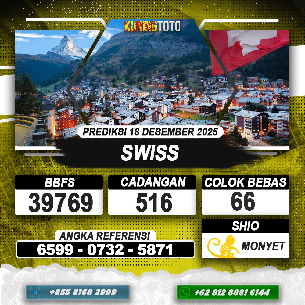 PREDIKSI TOGEL SWISS 18 DESEMBER 2025 – Selamat Datang di Situs Prediksi Togel Online Akurat dan Resmi KUNINGTOTO. Permainan Togel atau Toto Gelap ini telah lama menarik perhatian dan banyak dimainkan oleh para bettor. Sejak dulu permainan togel dimainkan dengan memasang taruhan angka dengan bandar darat yang tersedia di daerah masing – masing. Namun sekarang ini dengan perkembangan teknologi yang semakin maju, para bettor bisa menikmati permainan togel secara online. Anda bisa menemukan banyak6ya Situs Bandar Togel Online yang menyediakan layanan pemaangan angka togel secara praktis. Dimana masing – masing situs bandar togel online resmi dan terpercaya tentu menyediakan layanan dan keuntungan yang berbeda – beda untuk Anda.
