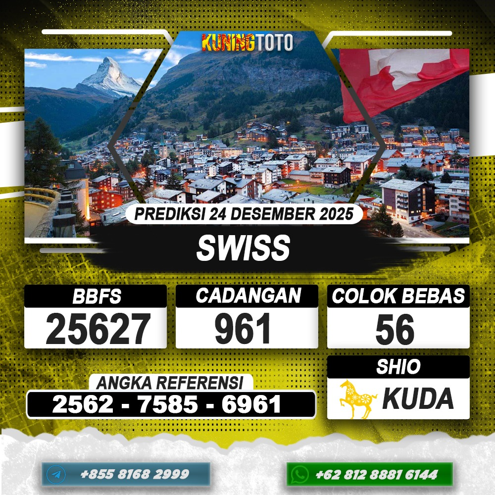 PREDIKSI TOGEL SWISS 23 DESEMBER 2025 – Selamat Datang di Situs Prediksi Togel Online Akurat dan Resmi KUNINGTOTO. Permainan Togel atau Toto Gelap ini telah lama menarik perhatian dan banyak dimainkan oleh para bettor. Sejak dulu permainan togel dimainkan dengan memasang taruhan angka dengan bandar darat yang tersedia di daerah masing – masing. Namun sekarang ini dengan perkembangan teknologi yang semakin maju, para bettor bisa menikmati permainan togel secara online. Anda bisa menemukan banyak6ya Situs Bandar Togel Online yang menyediakan layanan pemaangan angka togel secara praktis. Dimana masing – masing situs bandar togel online resmi dan terpercaya tentu menyediakan layanan dan keuntungan yang berbeda – beda untuk Anda.