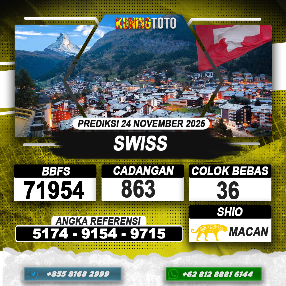 PREDIKSI TOGEL SWISS 24 NOVEMBER 2025 – Selamat Datang di Situs Prediksi Togel Online Akurat dan Resmi KUNINGTOTO. Permainan Togel atau Toto Gelap ini telah lama menarik perhatian dan banyak dimainkan oleh para bettor. Sejak dulu permainan togel dimainkan dengan memasang taruhan angka dengan bandar darat yang tersedia di daerah masing – masing. Namun sekarang ini dengan perkembangan teknologi yang semakin maju, para bettor bisa menikmati permainan togel secara online. Anda bisa menemukan banyak6ya Situs Bandar Togel Online yang menyediakan layanan pemaangan angka togel secara praktis. Dimana masing – masing situs bandar togel online resmi dan terpercaya tentu menyediakan layanan dan keuntungan yang berbeda – beda untuk Anda.