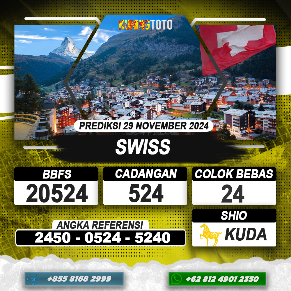 PREDIKSI TOGEL SWISS 29 NOV 2024 – Selamat Datang di Situs Prediksi Togel Online Akurat dan Resmi KUNINGTOTO. Permainan Togel atau Toto Gelap ini telah lama menarik perhatian dan banyak dimainkan oleh para bettor. Sejak dulu permainan togel dimainkan dengan memasang taruhan angka dengan bandar darat yang tersedia di daerah masing – masing. Namun sekarang ini dengan perkembangan teknologi yang semakin maju, para bettor bisa menikmati permainan togel secara online. Anda bisa menemukan banyaknya Situs Bandar Togel Online yang menyediakan layanan pemasangan angka togel secara praktis. Dimana masing – masing situs bandar togel online resmi dan terpercaya tentu menyediakan layanan dan keuntungan yang berbeda – beda untuk Anda.