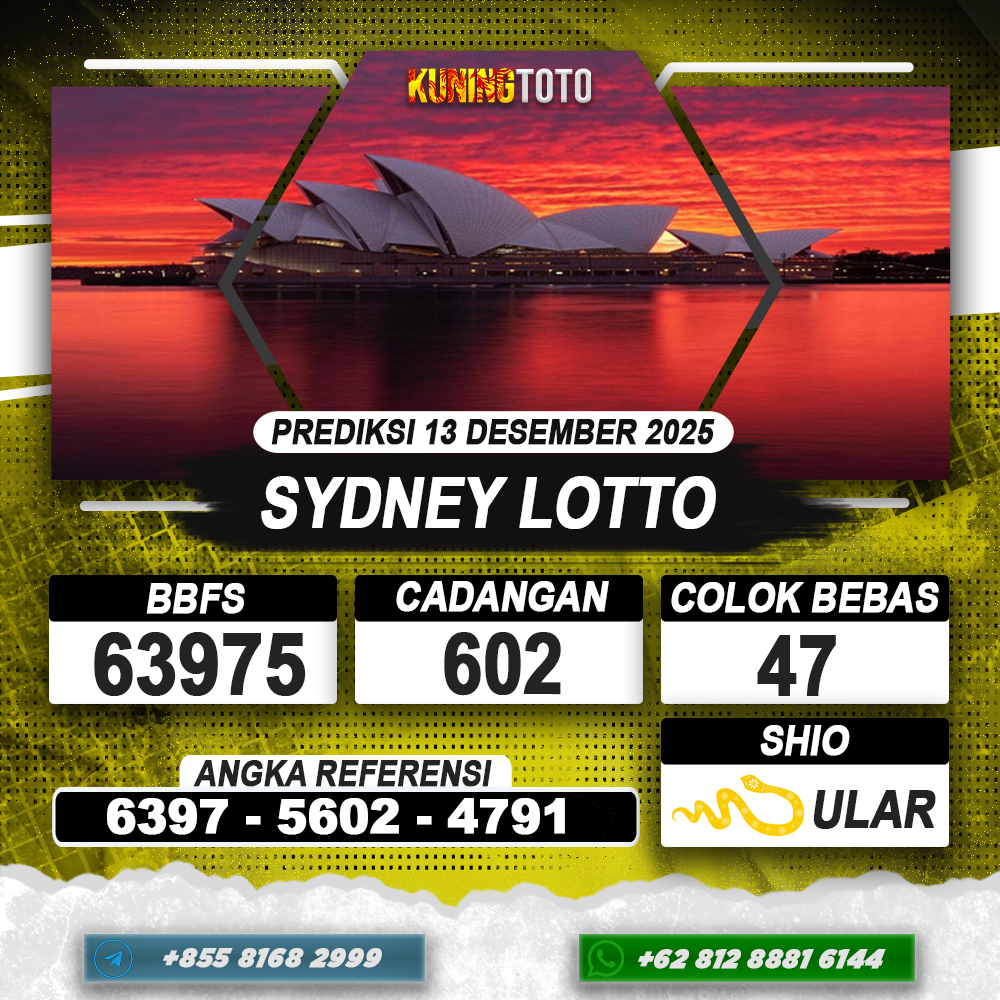 PREDIKSI TOGEL SYDNEY 13 DESEMBER 2025 – Selamat Datang di Situs Prediksi Togel Online Akurat dan Resmi KUNINGTOTO. Permainan Togel atau Toto Gelap ini telah lama menarik perhatian dan banyak dimainkan oleh para bettor. Sejak dulu permainan togel dimainkan dengan memasang taruhan angka dengan bandar darat yang tersedia di daerah masing – masing. Namun sekarang ini dengan perkembangan teknologi yang semakin maju, para bettor bisa menikmati permainan togel secara online. Anda bisa menemukan banyak6ya Situs Bandar Togel Online yang menyediakan layanan pemaangan angka togel secara praktis. Dimana masing – masing situs bandar togel online resmi dan terpercaya tentu menyediakan layanan dan keuntungan yang berbeda – beda untuk Anda.