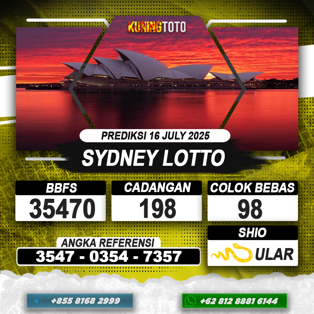 PREDIKSI TOGEL SYDNEY LOTTO 16 JULI 2025 – Selamat Datang di Situs Prediksi Togel Online Akurat dan Resmi KUNINGTOTO. Permainan Togel atau Toto Gelap ini telah lama menarik perhatian dan banyak dimainkan oleh para bettor. Sejak dulu permainan togel dimainkan dengan memasang taruhan angka dengan bandar darat yang tersedia di daerah masing – masing. Namun sekarang ini dengan perkembangan teknologi yang semakin maju, para bettor bisa menikmati permainan togel secara online. Anda bisa menemukan banyak6ya Situs Bandar Togel Online yang menyediakan layanan pemaangan angka togel secara praktis. Dimana masing – masing situs bandar togel online resmi dan terpercaya tentu menyediakan layanan dan keuntungan yang berbeda – beda untuk Anda.