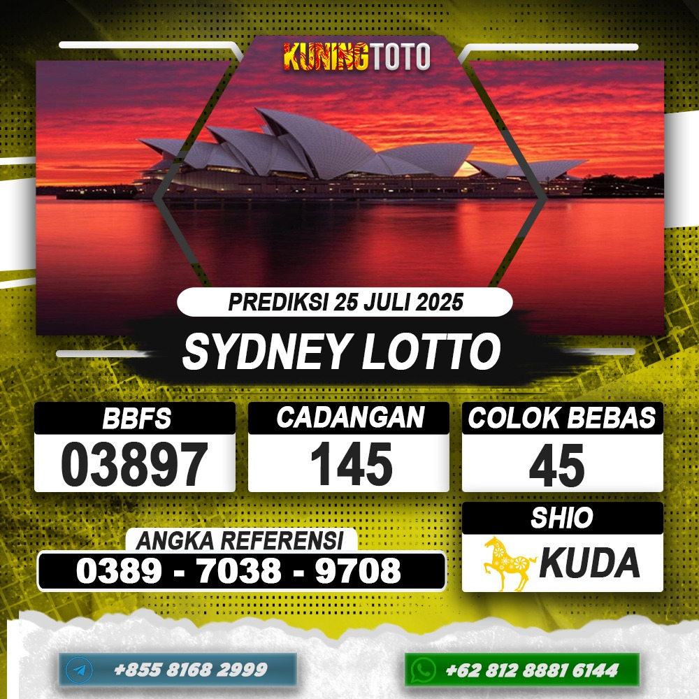 PREDIKSI TOGEL SYDNEY LOTTO 25 JULI 2025 – Selamat Datang di Situs Prediksi Togel Online Akurat dan Resmi KUNINGTOTO. Permainan Togel atau Toto Gelap ini telah lama menarik perhatian dan banyak dimainkan oleh para bettor. Sejak dulu permainan togel dimainkan dengan memasang taruhan angka dengan bandar darat yang tersedia di daerah masing – masing. Namun sekarang ini dengan perkembangan teknologi yang semakin maju, para bettor bisa menikmati permainan togel secara online. Anda bisa menemukan banyak6ya Situs Bandar Togel Online yang menyediakan layanan pemaangan angka togel secara praktis. Dimana masing – masing situs bandar togel online resmi dan terpercaya tentu menyediakan layanan dan keuntungan yang berbeda – beda untuk Anda.