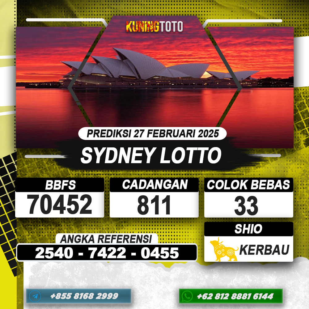 PREDIKSI TOGEL SYDNEY LOTTO 27 FEB 2025 – Selamat Datang di Situs Prediksi Togel Online Akurat dan Resmi KUNINGTOTO. Permainan Togel atau Toto Gelap ini telah lama menarik perhatian dan banyak dimainkan oleh para bettor. Sejak dulu permainan togel dimainkan dengan memasang taruhan angka dengan bandar darat yang tersedia di daerah masing – masing. Namun sekarang ini dengan perkembangan teknologi yang semakin maju, para bettor bisa menikmati permainan togel secara online. Anda bisa menemukan banyak6ya Situs Bandar Togel Online yang menyediakan layanan pemaangan angka togel secara praktis. Dimana masing – masing situs bandar togel online resmi dan terpercaya tentu menyediakan layanan dan keuntungan yang berbeda – beda untuk Anda.