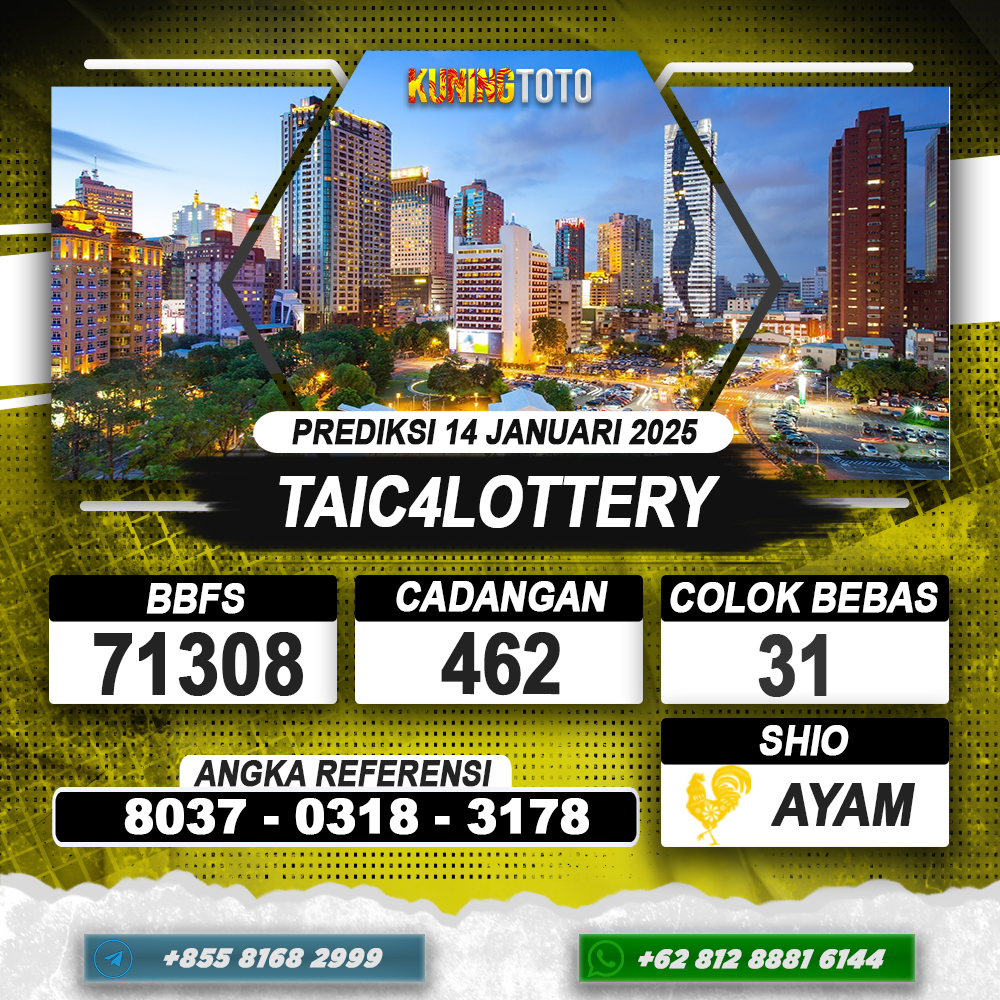 PREDIKSI TOGEL TAIC4LOTTERY 14 JAN 2025 – Selamat Datang di Situs Prediksi Togel Online Akurat dan Resmi KUNINGTOTO. Permainan Togel atau Toto Gelap ini telah lama menarik perhatian dan banyak dimainkan oleh para bettor. Sejak dulu permainan togel dimainkan dengan memasang taruhan angka dengan bandar darat yang tersedia di daerah masing – masing. Namun sekarang ini dengan perkembangan teknologi yang semakin maju, para bettor bisa menikmati permainan togel secara online. Anda bisa menemukan banyak6ya Situs Bandar Togel Online yang menyediakan layanan pemaangan angka togel secara praktis. Dimana masing – masing situs bandar togel online resmi dan terpercaya tentu menyediakan layanan dan keuntungan yang berbeda – beda untuk Anda.