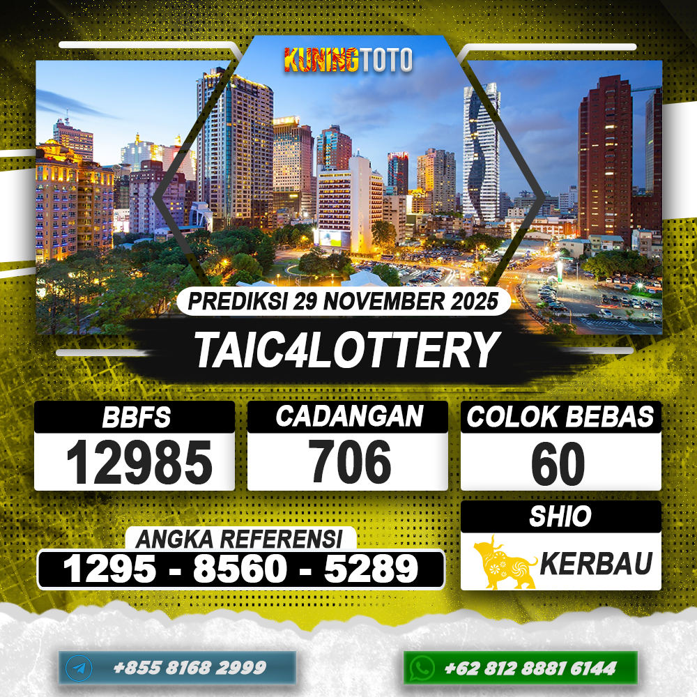 PREDIKSI TOGEL TAIC4LOTTERY 29 NOVEMBER 2025 – Selamat Datang di Situs Prediksi Togel Online Akurat dan Resmi KUNINGTOTO. Permainan Togel atau Toto Gelap ini telah lama menarik perhatian dan banyak dimainkan oleh para bettor. Sejak dulu permainan togel dimainkan dengan memasang taruhan angka dengan bandar darat yang tersedia di daerah masing – masing. Namun sekarang ini dengan perkembangan teknologi yang semakin maju, para bettor bisa menikmati permainan togel secara online. Anda bisa menemukan banyak6ya Situs Bandar Togel Online yang menyediakan layanan pemaangan angka togel secara praktis. Dimana masing – masing situs bandar togel online resmi dan terpercaya tentu menyediakan layanan dan keuntungan yang berbeda – beda untuk Anda.