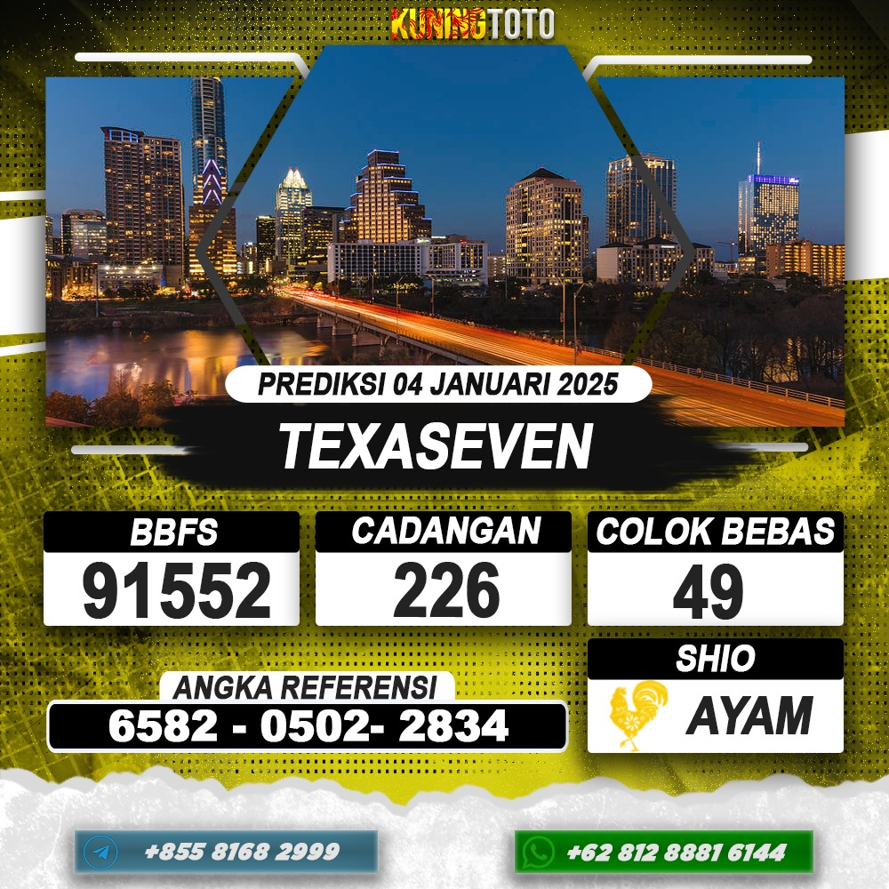 PREDIKSI TOGEL TEXASEVEN 04 JANUARI 2026 – Selamat Datang di Situs Prediksi Togel Online Akurat dan Resmi KUNINGTOTO. Permainan Togel atau Toto Gelap ini telah lama menarik perhatian dan banyak dimainkan oleh para bettor. Sejak dulu permainan togel dimainkan dengan memasang taruhan angka dengan bandar darat yang tersedia di daerah masing – masing. Namun sekarang ini dengan perkembangan teknologi yang semakin maju, para bettor bisa menikmati permainan togel secara online. Anda bisa menemukan banyak6ya Situs Bandar Togel Online yang menyediakan layanan pemaangan angka togel secara praktis. Dimana masing – masing situs bandar togel online resmi dan terpercaya tentu menyediakan layanan dan keuntungan yang berbeda – beda untuk Anda.