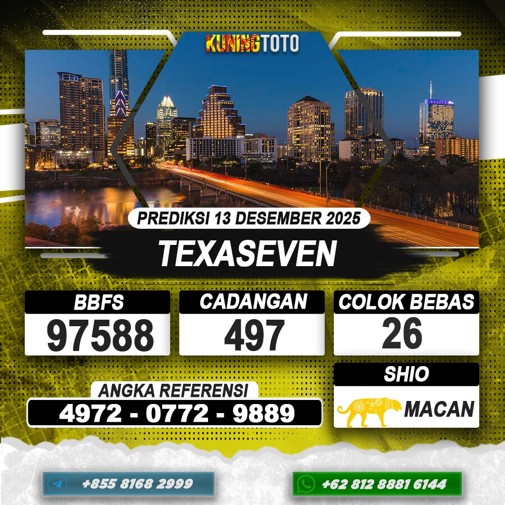 PREDIKSI TOGEL TEXASEVEN 13 DESEMBER 2025 – Selamat Datang di Situs Prediksi Togel Online Akurat dan Resmi KUNINGTOTO. Permainan Togel atau Toto Gelap ini telah lama menarik perhatian dan banyak dimainkan oleh para bettor. Sejak dulu permainan togel dimainkan dengan memasang taruhan angka dengan bandar darat yang tersedia di daerah masing – masing. Namun sekarang ini dengan perkembangan teknologi yang semakin maju, para bettor bisa menikmati permainan togel secara online. Anda bisa menemukan banyak6ya Situs Bandar Togel Online yang menyediakan layanan pemaangan angka togel secara praktis. Dimana masing – masing situs bandar togel online resmi dan terpercaya tentu menyediakan layanan dan keuntungan yang berbeda – beda untuk Anda.
