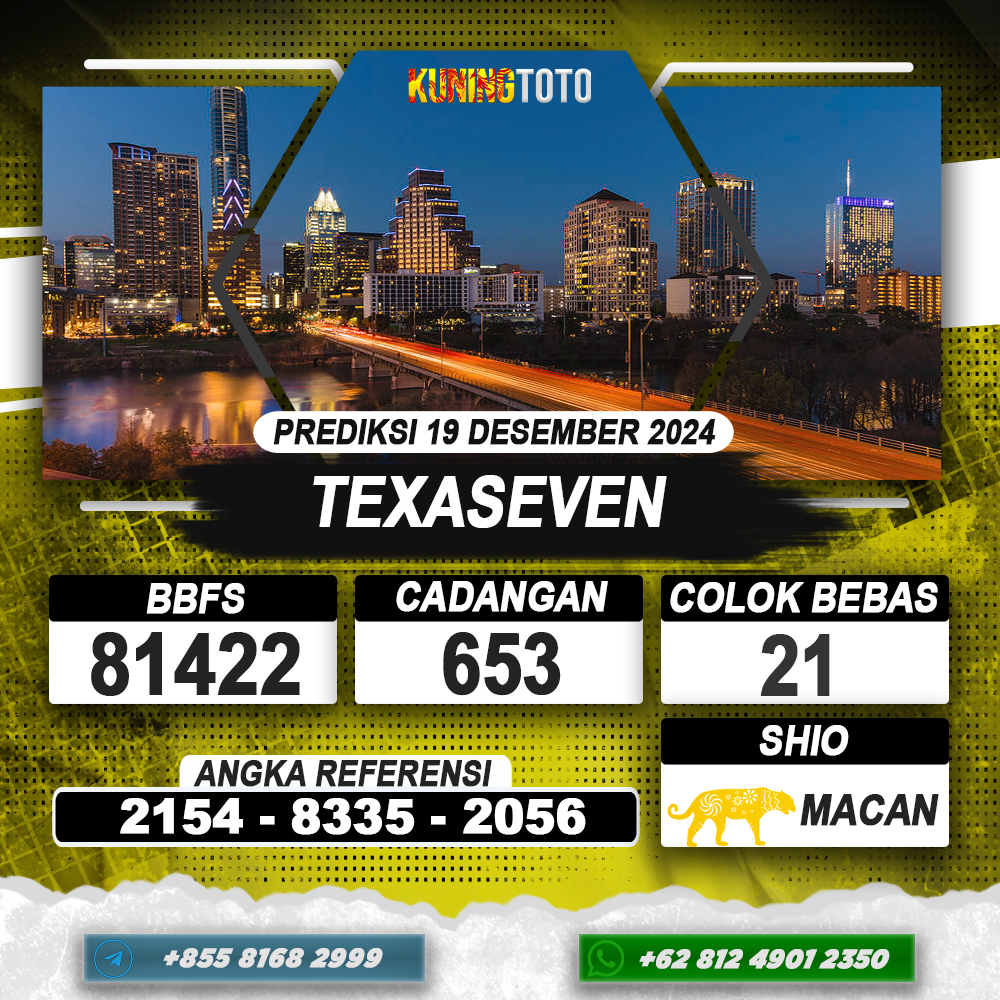 PREDIKSI TOGEL TEXASEVEN 19 DEC 2024 – Selamat Datang di Situs Prediksi Togel Online Akurat dan Resmi KUNINGTOTO. Permainan Togel atau Toto Gelap ini telah lama menarik perhatian dan banyak dimainkan oleh para bettor. Sejak dulu permainan togel dimainkan dengan memasang taruhan angka dengan bandar darat yang tersedia di daerah masing – masing. Namun sekarang ini dengan perkembangan teknologi yang semakin maju, para bettor bisa menikmati permainan togel secara online. Anda bisa menemukan banyaknya Situs Bandar Togel Online yang menyediakan layanan pemasangan angka togel secara praktis. Dimana masing – masing situs bandar togel online resmi dan terpercaya tentu menyediakan layanan dan keuntungan yang berbeda – beda untuk Anda.