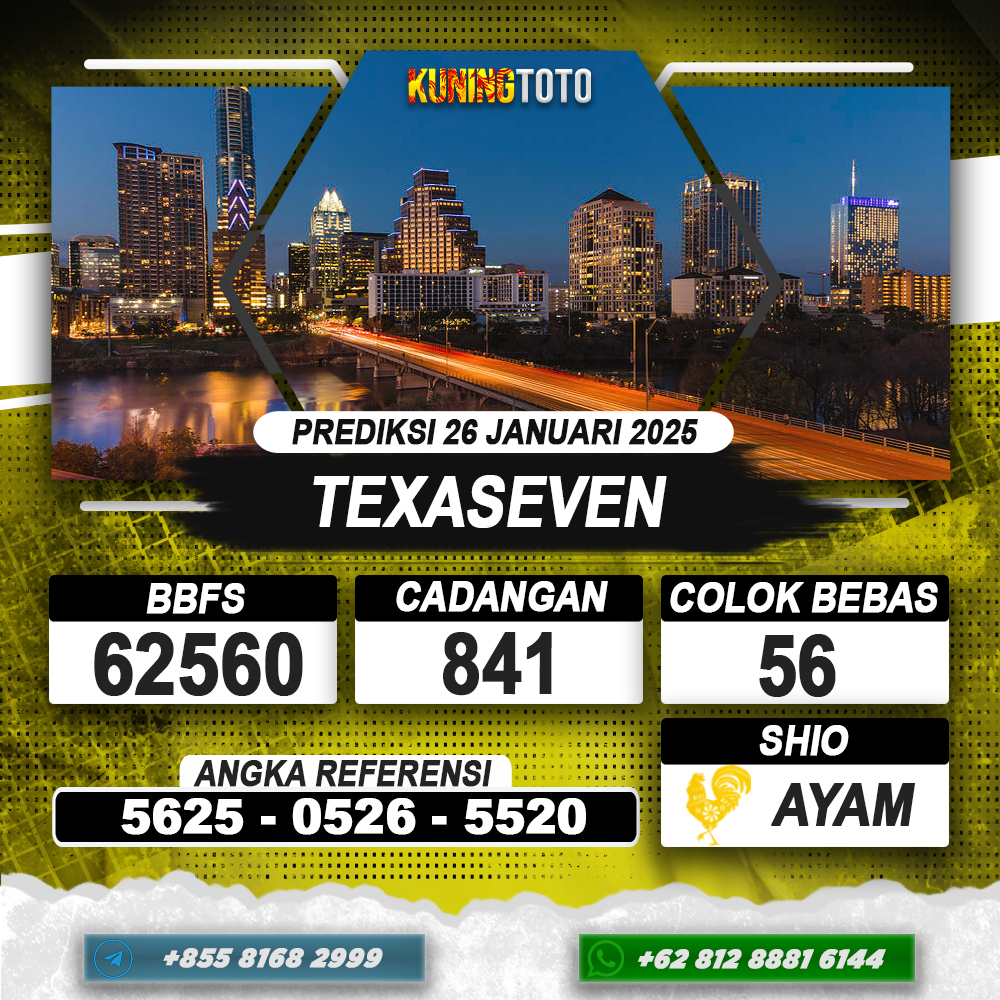 PREDIKSI TOGEL TEXASEVEN 26 JAN 2025 – Selamat Datang di Situs Prediksi Togel Online Akurat dan Resmi KUNINGTOTO. Permainan Togel atau Toto Gelap ini telah lama menarik perhatian dan banyak dimainkan oleh para bettor. Sejak dulu permainan togel dimainkan dengan memasang taruhan angka dengan bandar darat yang tersedia di daerah masing – masing. Namun sekarang ini dengan perkembangan teknologi yang semakin maju, para bettor bisa menikmati permainan togel secara online. Anda bisa menemukan banyak6ya Situs Bandar Togel Online yang menyediakan layanan pemaangan angka togel secara praktis. Dimana masing – masing situs bandar togel online resmi dan terpercaya tentu menyediakan layanan dan keuntungan yang berbeda – beda untuk Anda.