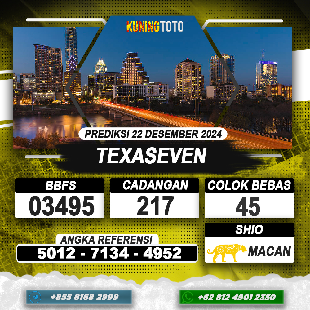 PREDIKSI TOGEL TEXASEVEN 22 DEC 2024 – Selamat Datang di Situs Prediksi Togel Online Akurat dan Resmi KUNINGTOTO. Permainan Togel atau Toto Gelap ini telah lama menarik perhatian dan banyak dimainkan oleh para bettor. Sejak dulu permainan togel dimainkan dengan memasang taruhan angka dengan bandar darat yang tersedia di daerah masing – masing. Namun sekarang ini dengan perkembangan teknologi yang semakin maju, para bettor bisa menikmati permainan togel secara online. Anda bisa menemukan banyaknya Situs Bandar Togel Online yang menyediakan layanan pemasangan angka togel secara praktis. Dimana masing – masing situs bandar togel online resmi dan terpercaya tentu menyediakan layanan dan keuntungan yang berbeda – beda untuk Anda.