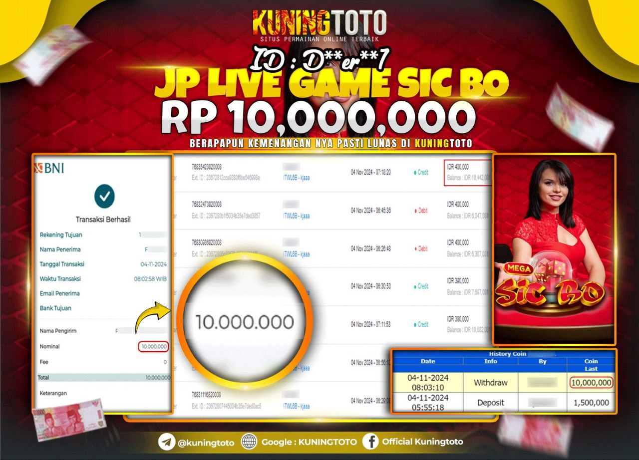 Bukti JackPot Live Casino Member KUNINGTOTO 04 November 2024 PP Live Mega Sicbo Memenangkan Jackpot Permainan Slot online sangat populer…